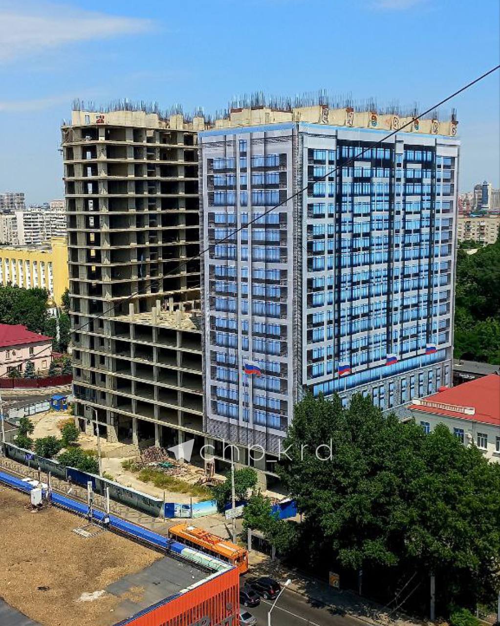 Один корпус ЖК «Скала» на Аэродромной успешно сдан в эксплуатацию обтянут маскировочным баннером.
